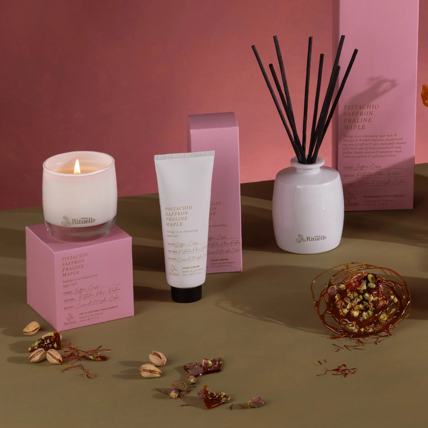 🥜 Pistachio, Saffron, Praline & Maple Fragrance Diffuser Set (220ml) By Urban Rituelle ✨🍫 - smooth, warm